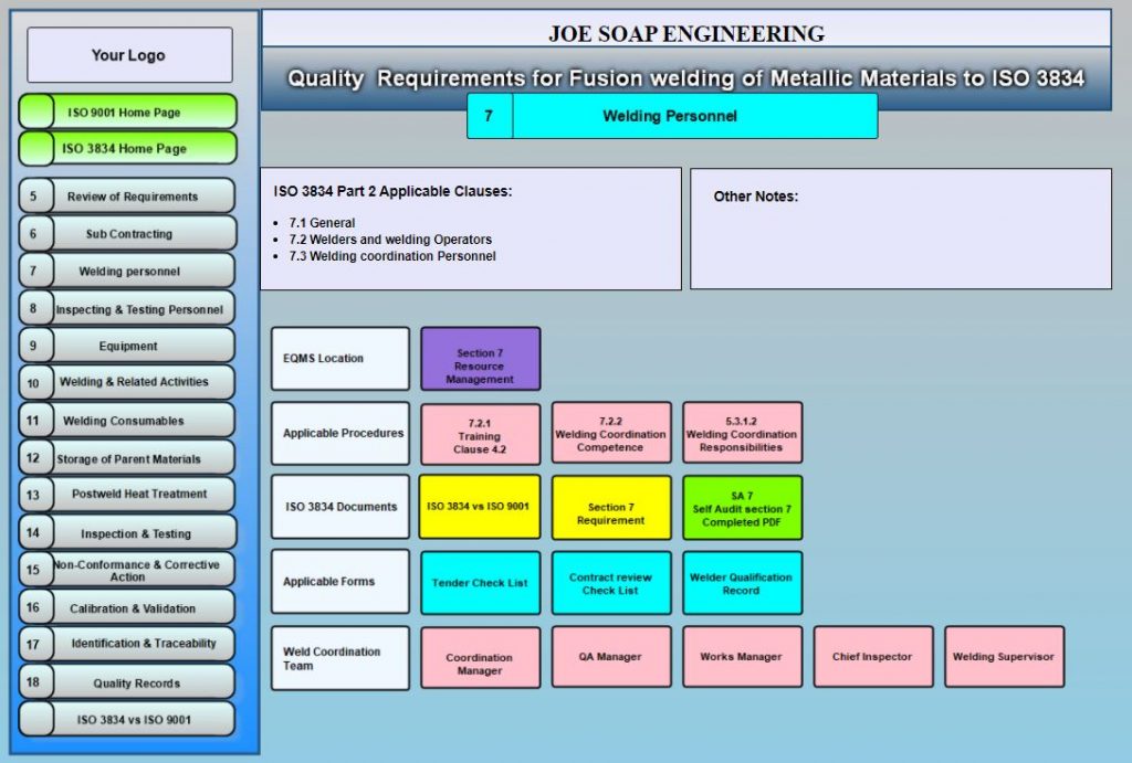 The system addresses all requirements and elements of ISO 3834 with links to specific subsections. See below